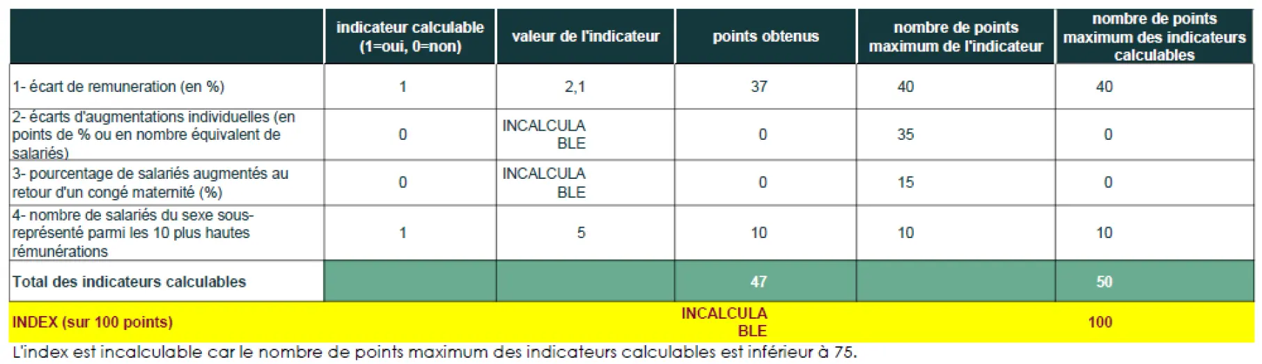 A noter que pour l'indicateur qui concerne le retour de congés maternité, aucun retour de congé maternité n’est intervenu au cours de la période de référence. Il n'est donc pas calculable.