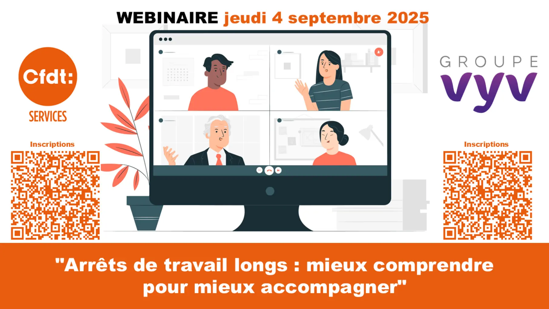 La fédération des Services CFDT et le groupe de protection sociale VYV organisent un webinaire sur les arrêts de travail longs. Il aura lieu le jeudi 4 septembre 2025 de 11h à 13h. Inscrivez-vous dès maintenant pour recevoir le lien et le rappel de ce rendez-vous quelques jours avant !