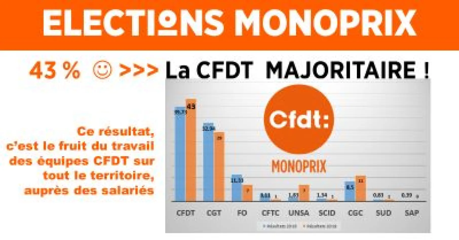 Avec un score de 43 % aux élections, la CFDT confirme sa première place chez Monoprix et reste majoritaire !