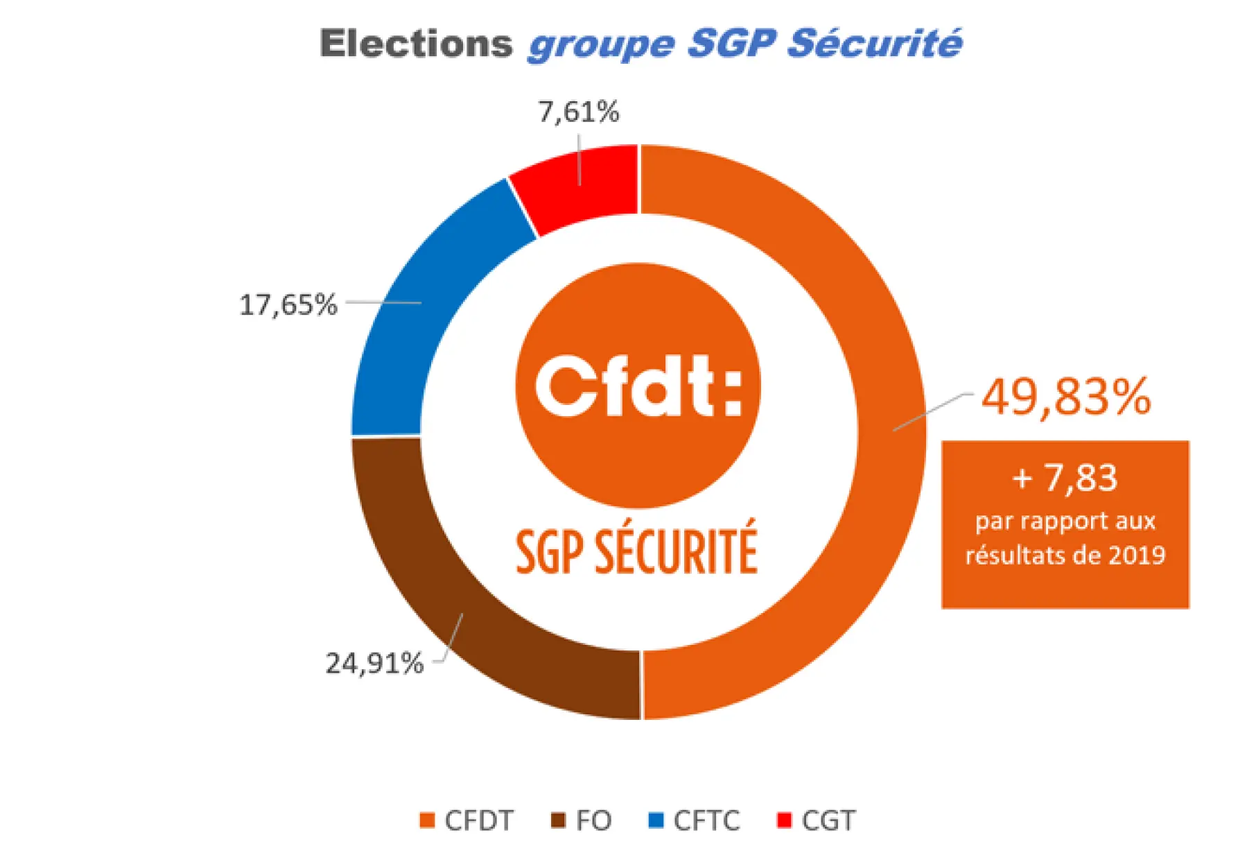 Malgré la présence de trois autres syndicats, dont deux nouveaux par rapport à 2019, la CFDT progresse de 7,83 points et devient le premier syndicat chez Groupe SGP Sécurité qui emploie 968 salariés. La CGT qui était jusqu'à ces élections largement majoritaire n'est plus représentative.