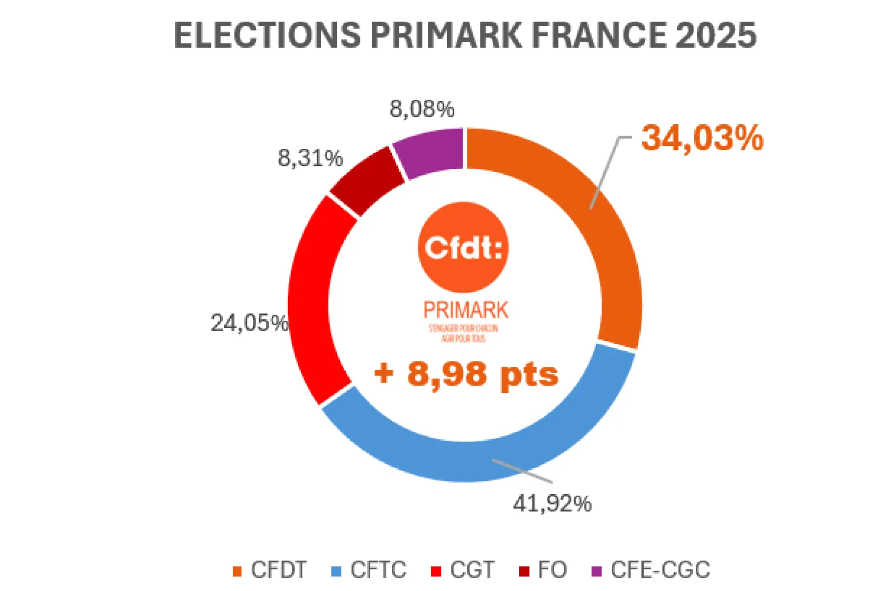 Très active sur les réseaux sociaux et sur le terrain, l’équipe CFDT Primark peut être fière des résultats obtenus aux élections des membres du conseil économique et social (CSE). Elle progresse de près de 9 points !