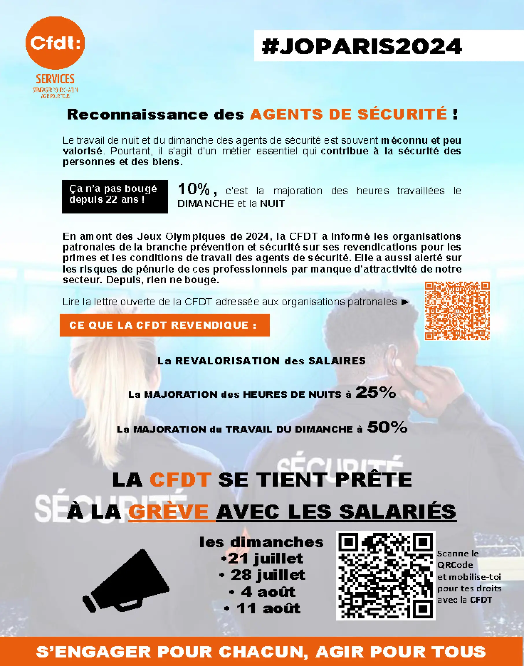 La CFDT n'accepte pas que les agents de sécurité privée soient encore une fois les grands oubliés. Alors que les majorations du travail de nuit et du dimanche n'ont pas été revalorisées depuis 22 ans et que les travailleurs du secteur devront fournir un effort important pour la sécurité des #JOParis2024, le patronat de la branche continue de faire la sourde oreille aux revendications de la CFDT. Le 11 juin aura lieu la dernière réunion de négociation. Sans accord, la CFDT appellera les salariés du secteur à se mobiliser les dimanches 21; 28 juillet et 4 et 11 août.