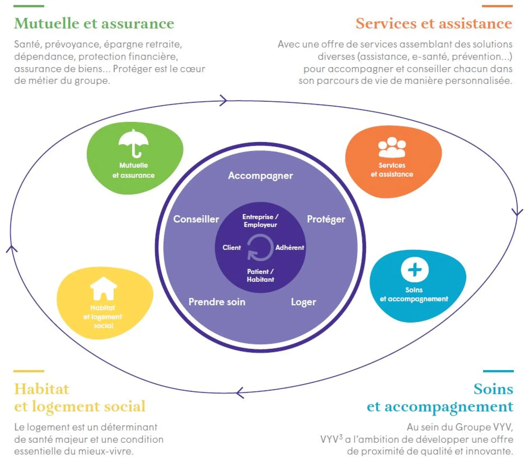 Le Groupe VYV (Harmonie Mutuelle, MGEFI, MGEN, Mutuelle Mare-Gaillard, Mutuelle Nationale Territoriale, SMACL Assurances) a pour objectif de bâtir un pôle mutualiste de santé et de protection sociale ambitieux, entreprenant et moderne, à la hauteur des enjeux sociétaux d’aujourd’hui et de demain. « Entrepreneur du mieux-vivre », le Groupe VYV souhaite satisfaire les attentes de ses adhérents, clients, patients et habitants, par le développement de ses solutions au service du mieux-vivre. Concrètement, il s’agit de déployer, progressivement, une logique de service généralisée et d’agir sur l’ensemble des déterminants de santé (soin, logement, prévention…) en s’appuyant sur les savoir-faire de ses 4 métiers : mutuelle et assurance, services et assistance, soins et accompagnement, habitat et logement social.