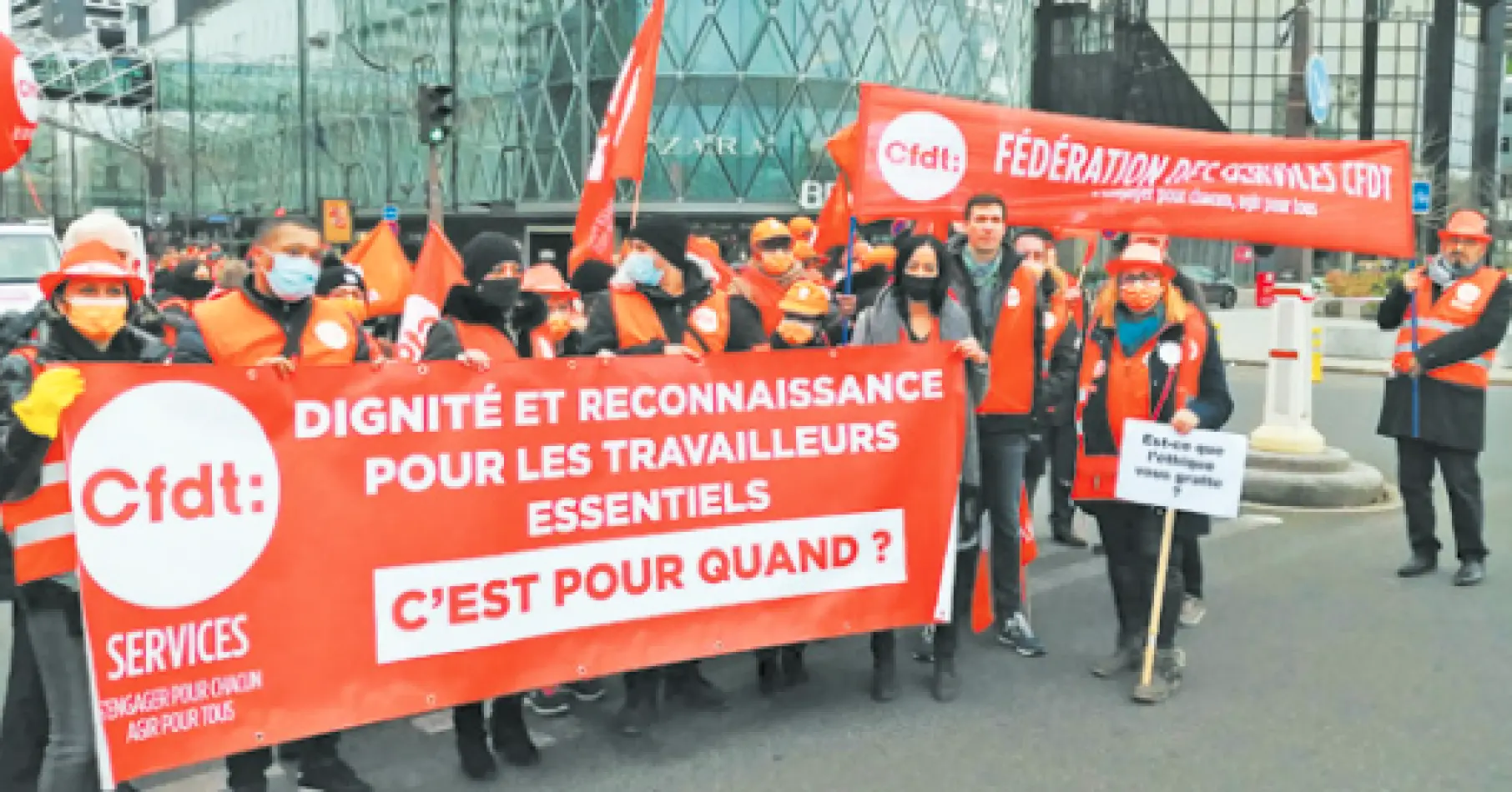 La fédération des Services, soutenue par les fédérations de la fonction publique et de l'agroalimentaire CFDT Interco et Agri-Agro, a organisé une marche avec les travailleurs de la propreté, du commerce, de la sécurité, des services publics et de l'agroalimentaire le 3 février 2022